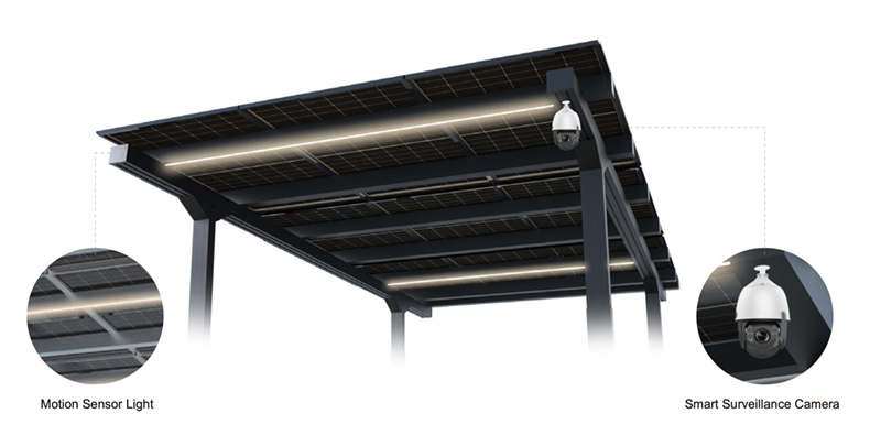 The structure of the carport is built from powder-coated aluminium alloy, while the base is made of galvanized carbon steel, a much tougher material for bearing the weight of all those big panels. All these materials are non-corrosive, which makes the whole carport waterproof, an essential feature.